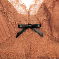 Details & Fit A going-out staple, see and be seen in this tan dot mesh bodysuit. The plunging V-neckline and lace trims add extra sensuality – pair its neutral hue with sparkling minis and baggy denim alike. - Fitted style, take one size up if between sizes - Popper closure at gusset - Lined at bust - Lace trims and panelling - Bow detailing - Model is 5ft10/178cm and wears a size UK 6 COMPOSITION Main Fabric 1: 82% Polyamide 18% Elastane Main Fabric 2: 100% Polyester Main Fabric 3: 100% Polyester Lace Trim: 100% Polyamide Lining: 87% Polyester 13% Elastane