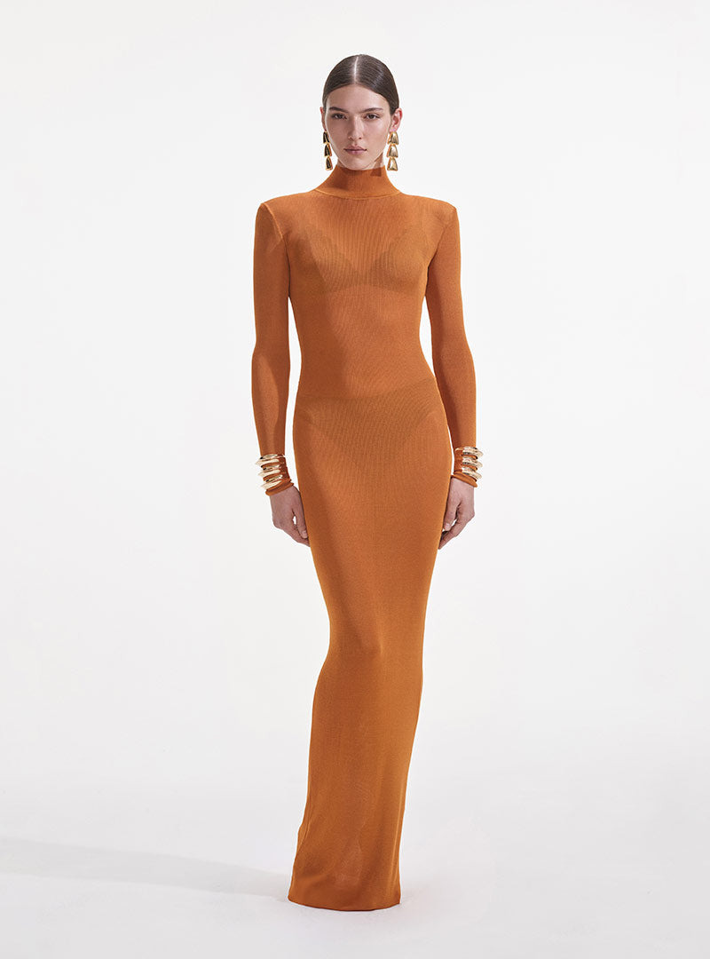 Details & Fit Striking in its simplicity, this viscose maxi dress shines with its burnt orange hue. Removable shoulder pads create an elegant minimalist form – add statement jewellery for a knockout party look. - True to size - Fabric has stretch - Unlined style - Removable shoulder pads - Model is 5ft10/178cm and wears a size S - Check the Size Guide to find your perfect fit COMPOSITION Main: 100% Viscose