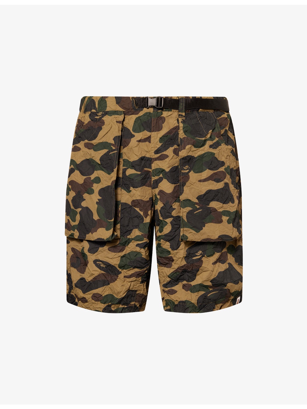 PRODUCT DETAILS - A Bathing Ape cotton shorts - 100% cotton - Pulls on - Relaxed fit, elasticated waist, woven buckle belt, side pockets, all-over camo print, patch pockets, mesh lining, crinkled texture - Machine wash mild - Model is 6ft 2in/1.88m and wears a size medium - Lightweight, non-stretch Ref: R04437908