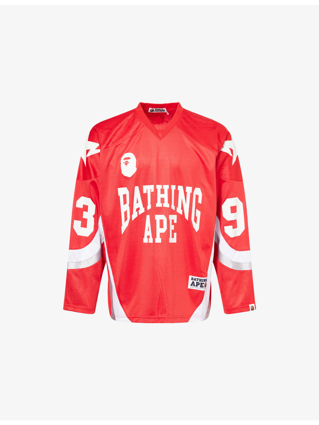 PRODUCT DETAILS - A Bathing Ape jersey T-shirt - 100% polyester - Relaxed fit, V-neck, ribbed trim at neck, dropped shoulders, long sleeves, perforated design, logo print at front, graphic print at front, brand and numbers print at back and sleeves, contrast stripe trims, subtle camo pattern, jersey texture - Machine wash at 40°C - Model is 6ft 2in/1.88m and wears a size medium - Lightweight, non-stretch Ref: R04495925