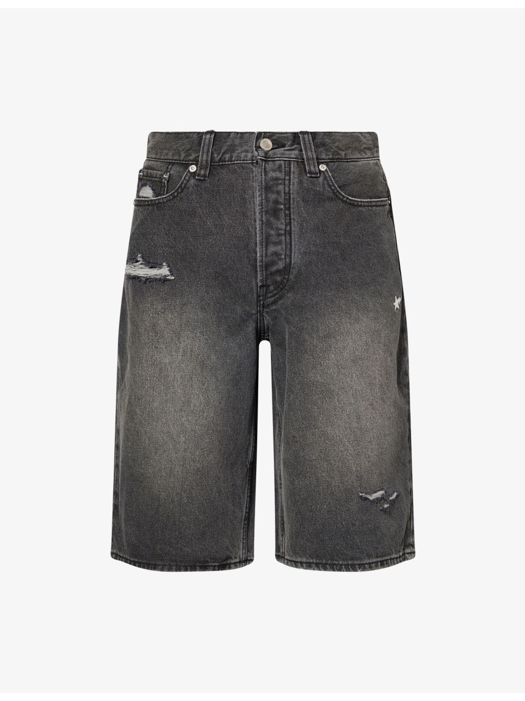 PRODUCT DETAILS - A Bathing Ape denim shorts - 100% cotton - Exposed button and concealed zip-fly fastening at front - Regular fit, mid-rise, wide leg, structured waistband with belt loops, five pockets, branded silver-toned hardware, brand embroidery at front and back, distressed, faded effect, camouflage brand patch at back - Machine wash at 40°C - Size medium: rise 12in / 30cm, inside leg 13in / 34cm, leg opening 24in / 61cm - Model is 6ft 2in/1.88m and wears a size medium - Midweight, non-stretch Ref: R04495919