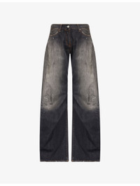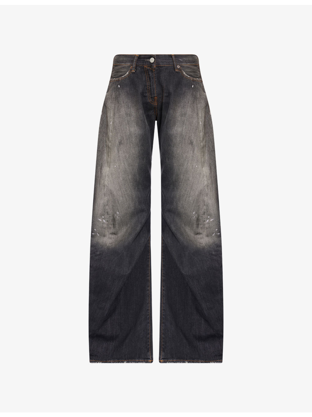 PRODUCT DETAILS - Acne Studios denim jeans - 100% cotton; trims 100% cow leather - Exposed button and concealed zip-fly fastening at front - Loose fit, low-rise, wide leg, structured waistband with belt loops, five pockets, splash print, brand patch at back, contrast stitching, coated finish - Hand wash - Made in Italy - True to size - Size 26: rise 9in / 23cm, inside leg 33in / 84cm, leg opening 22in / 56cm - Model is 5ft 10in/1.78m and wears a size 26 - Midweight, non-stretch Ref: R04492145