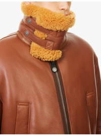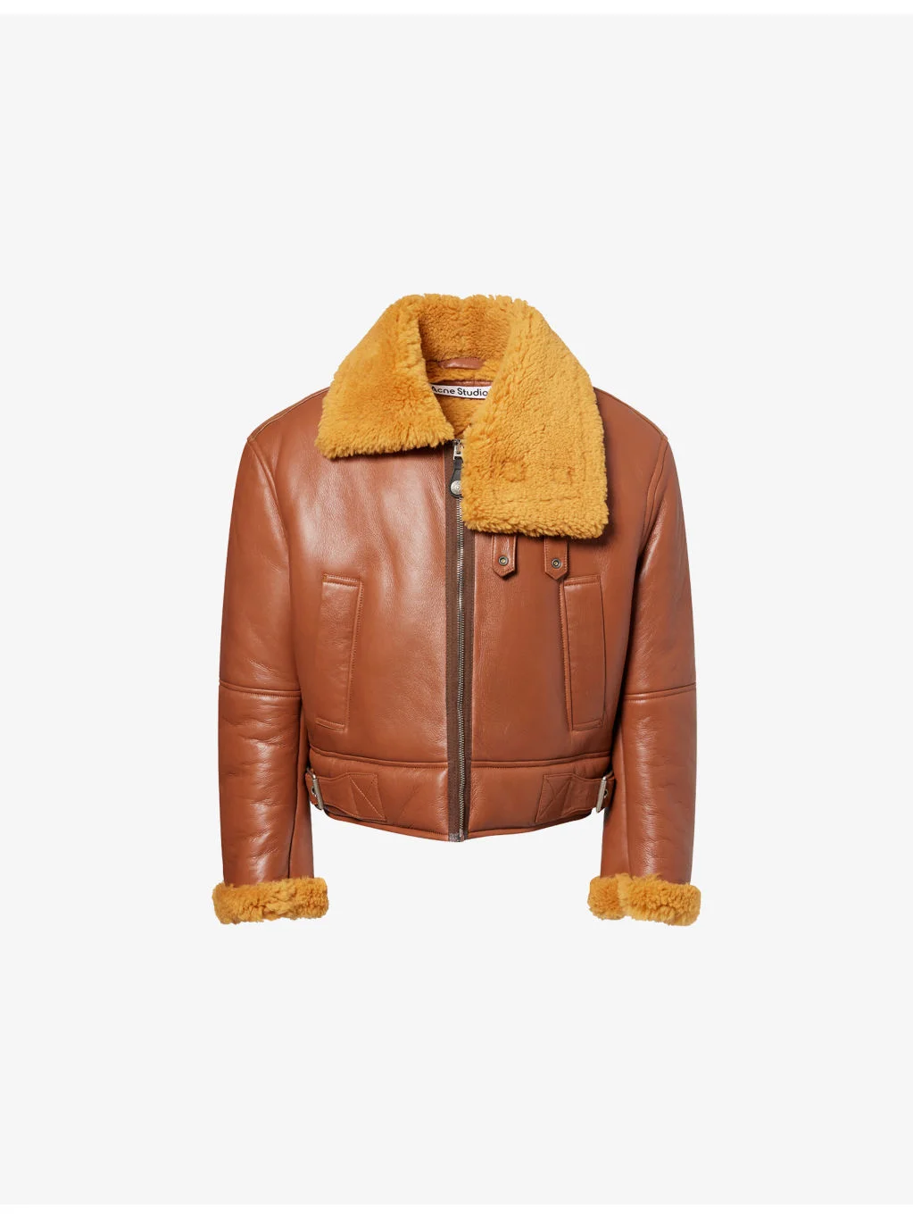 PRODUCT DETAILS - Acne Studios leather jacket - 100% lamb shearling - Exposed zip fastening at front - Relaxed fit, shearling collar with straps, long sleeves, shearling cuffs, metal logo plaque at back, cuff zips, two side slip pockets, adjustable side tabs with buckles, silver-toned hardware, grained finish - Specialist leather clean - Size medium: length 24in / 61cm, chest 40in / 101.5cm - Model is 6ft 2in/1.88m and wears a size medium - Heavyweight, non-stretch Ref: R04493824
