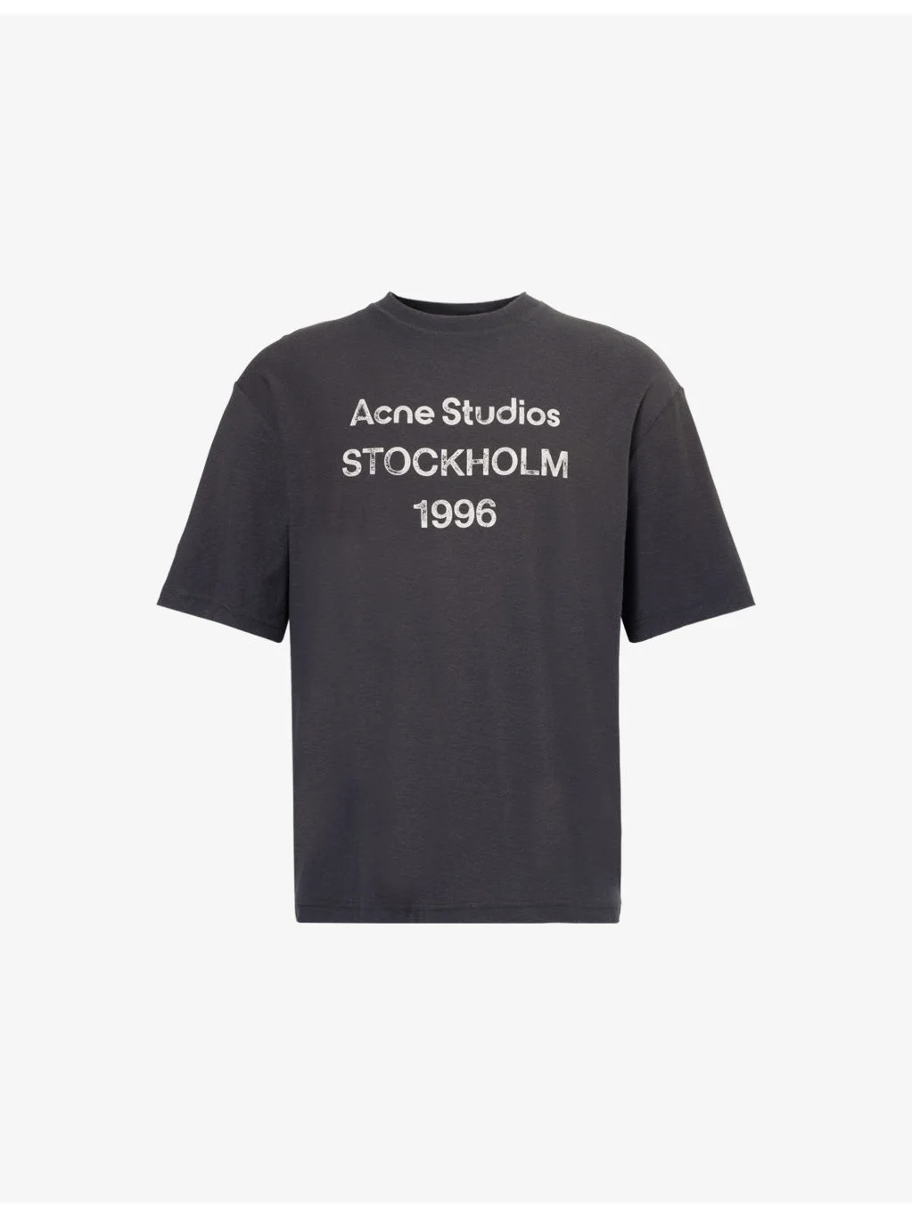 PRODUCT DETAILS - Acne Studios cotton-blend jersey T-shirt - 85% cotton, 15% hemp - Pulls on - Regular fit, crewneck, ribbed trim at neck, short sleeves, brand text print at chest - Machine wash cold - Made in Portugal - Model is 6ft 2in/1.88m and wears a size medium - Lightweight, stretchy Ref: R04313457