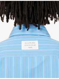 PRODUCT DETAILS - Acne Studios woven shirt - 84% lyocell, 16% polyester - Exposed button fastening at front - Oversized fit, pointed collar, long sleeves, buttoned cuffs, one patch pocket at chest, brand patch at back, all-over pinstripe pattern, curved hem - Machine wash at 30°C - Made in Morocco - Size 50: length 35in / 89cm, chest 66.1in / 168cm - Model is 6ft 2in/1.88m and wears a size UK 40 - Lightweight, non-stretch Ref: R04493809