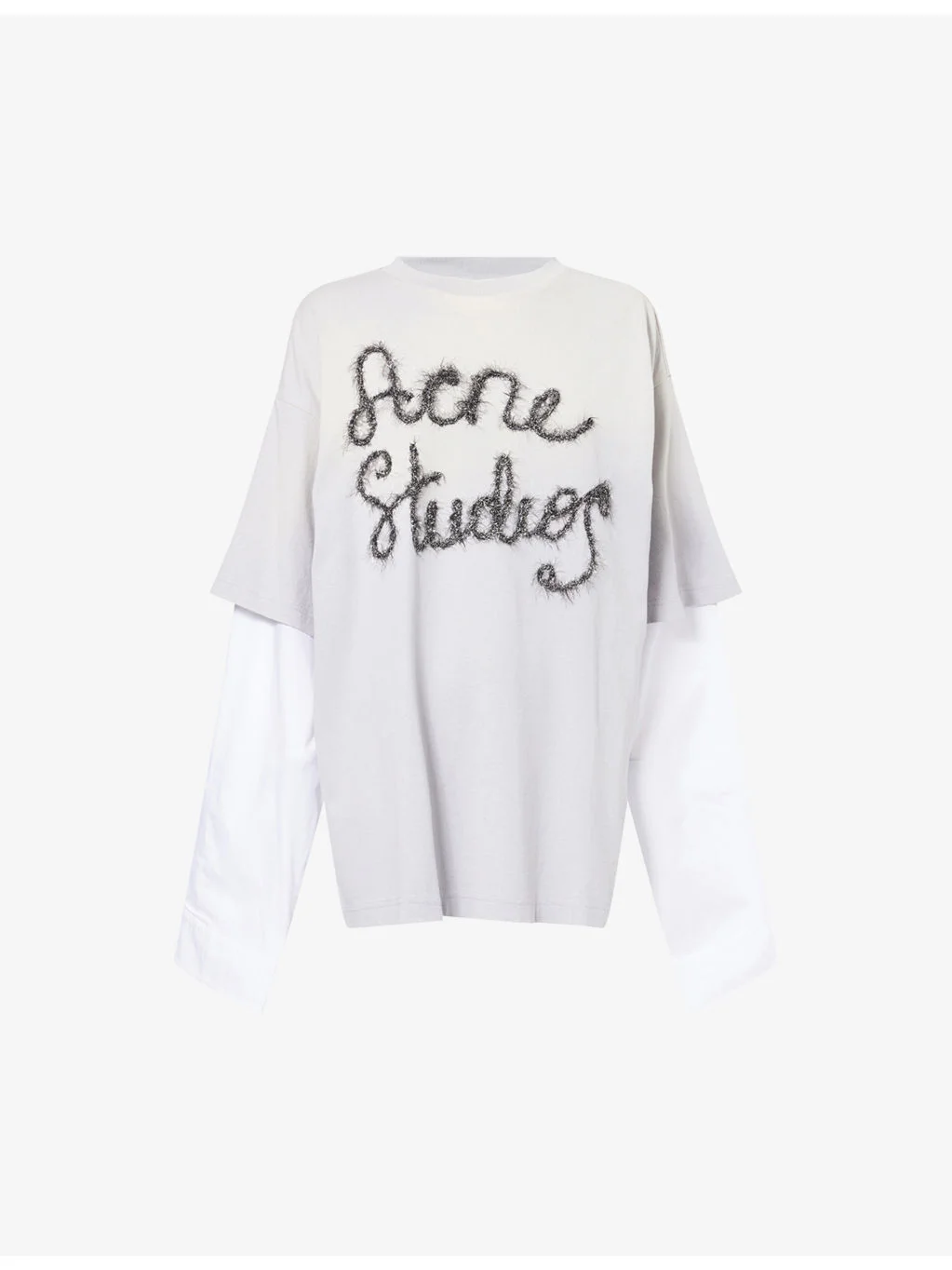 PRODUCT DETAILS - Acne Studios cotton-jersey T-shirt - 100% cotton; contrast 100% cotton; embroidery 65% nylon, 35% polyester - Relaxed fit, round-neck, ribbed trim at neck, layered long sleeves, buttoned cuffs, tinsel-embellished logo at front, jersey texture - Machine wash at 30°C - Made in Portugal - True to size - Model is 5ft 10in/1.78m and wears a size small - Lightweight, slight stretch Ref: R04562029