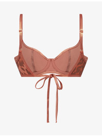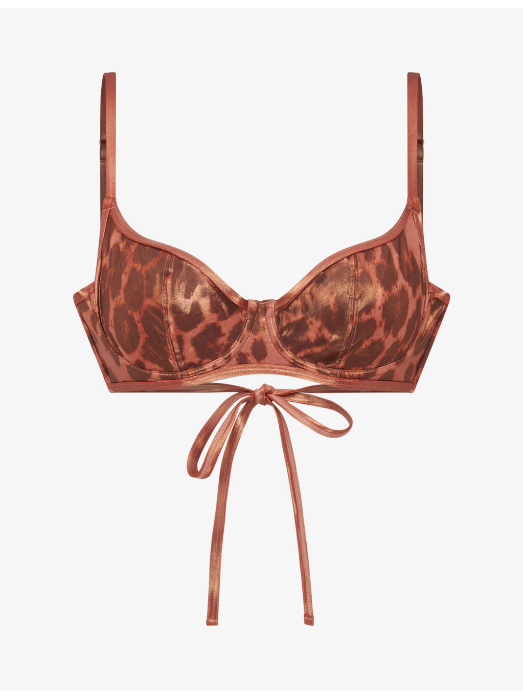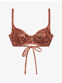 PRODUCT DETAILS - Agent Provocateur bikini top - 83% polyamide, 17% elastane - Self-tie fastening - Underwired cups, adjustable straps, all-over leopard print, metallic finish - Hand wash - True to size - Model is 5ft 10in/1.78m and wears a size UK 8 - Lightweight, stretchy - For hygiene reasons, we are unable to exchange or refund this product, unless faulty. Ref: R04526324