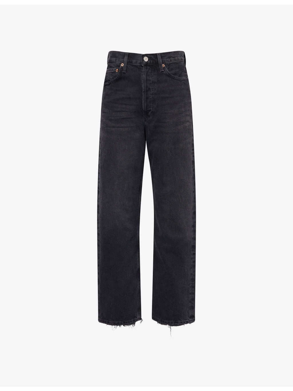 PRODUCT DETAILS - AGOLDE denim jeans - 100% cotton - Button and button-fly fastening - Loose fit, mid-rise, tapered leg, structured waistband with belt loops, five pockets, brand patch at back, garment-dyed dark wash, branded hardware, frayed hems - Machine wash cold - Made in Turkey - True to size - Size 26: rise 12in / 31cm, inside leg 28in / 71cm, leg opening 15in / 38cm - Model is 5ft 10in/1.78m and wears a size 26 - Midweight, non-stretch Ref: R04491114