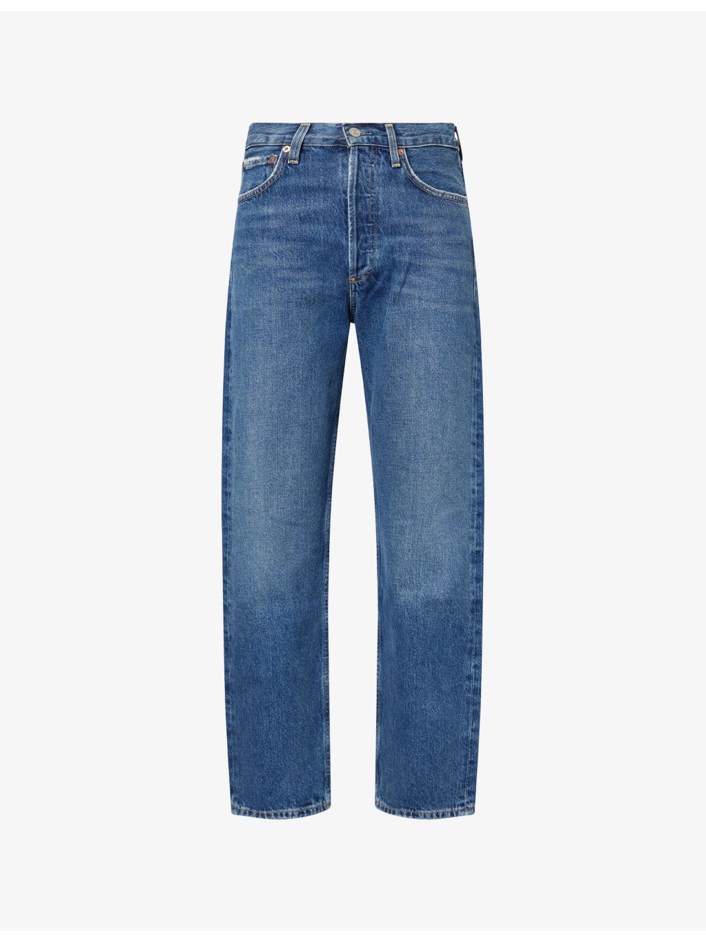 PRODUCT DETAILS - AGOLDE denim jeans - 100% cotton - Exposed button and concealed button-fly fastening at front - Loose fit, mid-rise, straight leg, belt loops, five pockets, faded wash and whiskering - Machine wash cold - Made in Turkey - True to size - Size 26: rise 12in / 31cm, inside leg 28in / 72cm, leg opening 14in / 36cm - Model is 5ft 10in/1.78m and wears a size 26 - Midweight, slight stretch Ref: R04487032