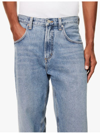 PRODUCT DETAILS - AGOLDErecycled-denim jeans - 100% recycled cotton - Exposed button and concealed zip-fly fastening at front - Regular fit, mid-rise, tapered leg, belt loops, classic five pockets, contrast stitching, faded wash - Machine wash cold - Size UK 30: rise 12.5in / 32cm, inside leg 31in / 79cm, leg opening 18in / 46cm - Model is 6ft 2in/1.88m and wears a size UK 30 - Midweight, non-stretch Ref: R04350741
