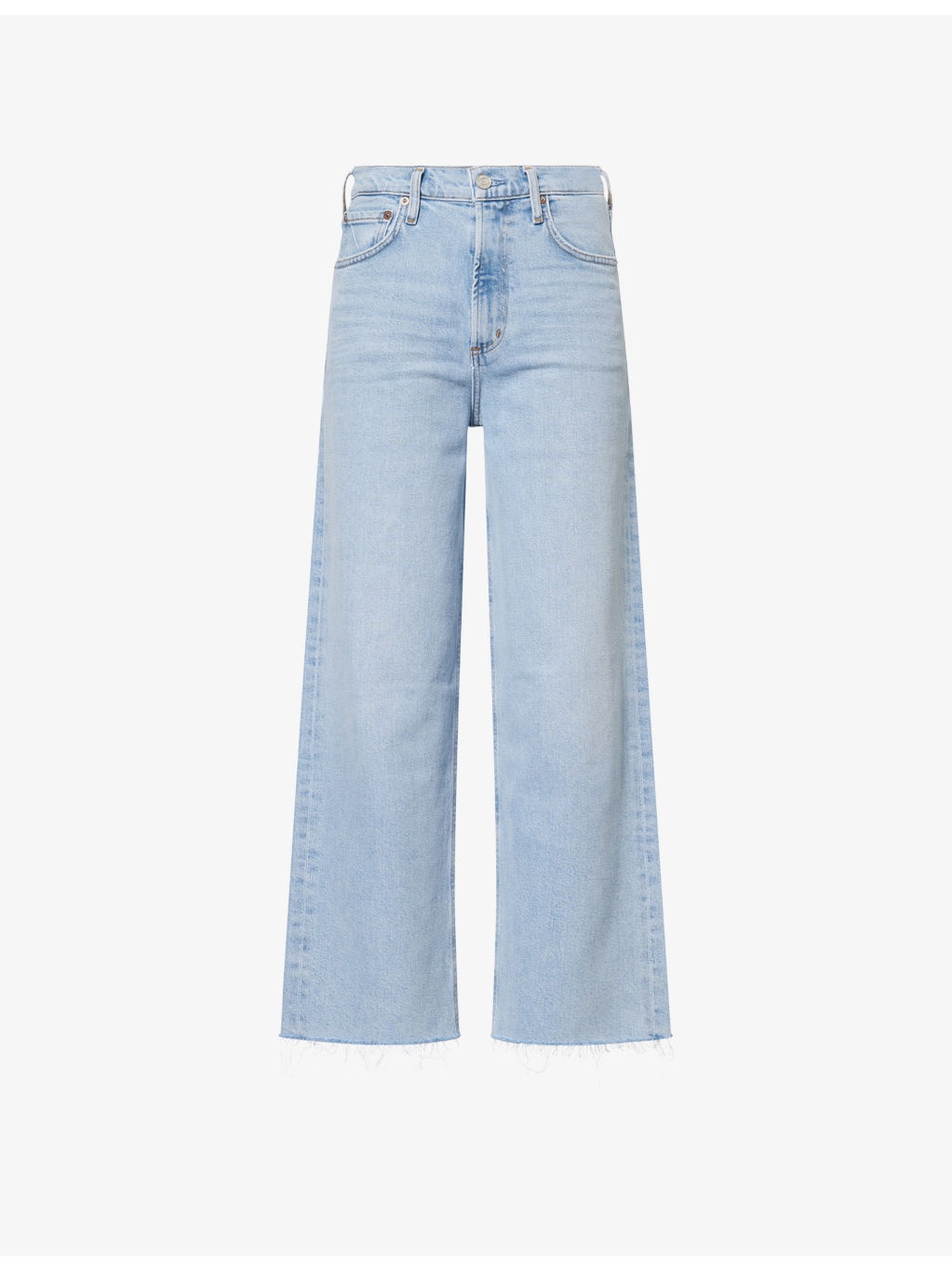 PRODUCT DETAILS - AGOLDE denim jeans - 99% cotton, 1% elastane - Button and zip-fly fastenings at front - Regular fit, high-rise, wide-leg, belt loops, five pockets, raw hem - Machine wash cold - Made in Turkey - True to size - Size 26: rise 11.5in / 29.5cm, inside leg 27in / 69cm, leg opening 19in / 48.5cm - Model is 5ft 10in/1.78m and wears a size 26 - Midweight, slight stretch Ref: R04460482