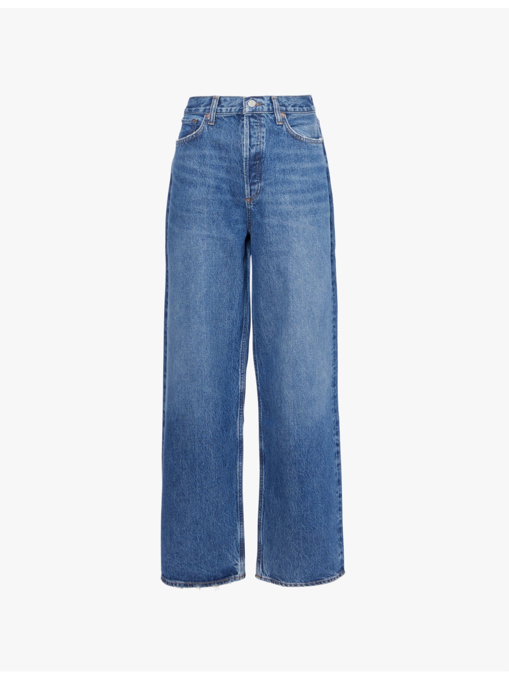 PRODUCT DETAILS - AGOLDE organic-denim blend jeans - 67% organic cotton, 22% recycled lyocell, 11% recycled cotton - Exposed button and concealed button-fly fastening at front - Relaxed fit, high-rise, wide leg, belt loops, five pockets, faded wash and whiskering - Machine wash cold - Made in Turkey - True to size - Size 26: rise 12in / 32cm, inside leg 29in / 75cm, leg opening 20in / 51cm - Model is 5ft 10in/1.78m and wears a size 26 - Midweight, slight stretch Ref: R04342852