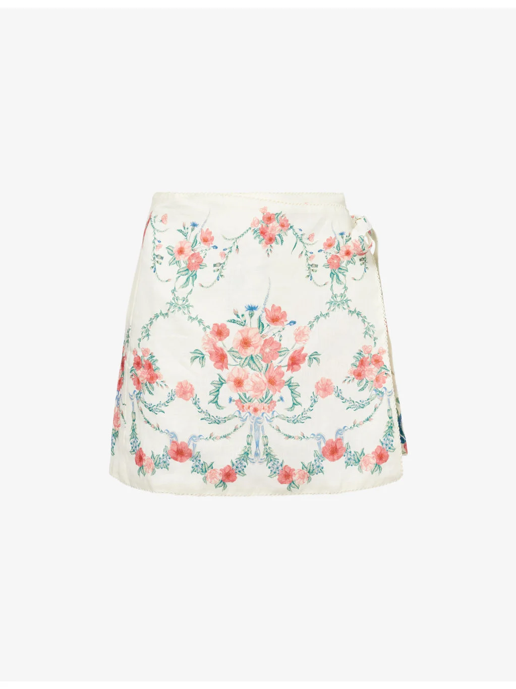 PRODUCT DETAILS - Agua By Agua Bendita linen mini skirt - 100% linen; lining 70% cotton, 30% linen - Concealed button fastening and self-tie fastening at side - Regular fit, mid-waist, wrap front, all-over floral print, fully lined, embroidered trims - Machine wash at 30°C - True to size - Size small: length 14in / 37cm - Model is 5ft 10in/1.78m and wears a size small - Midweight, slight stretch Ref: R04539534