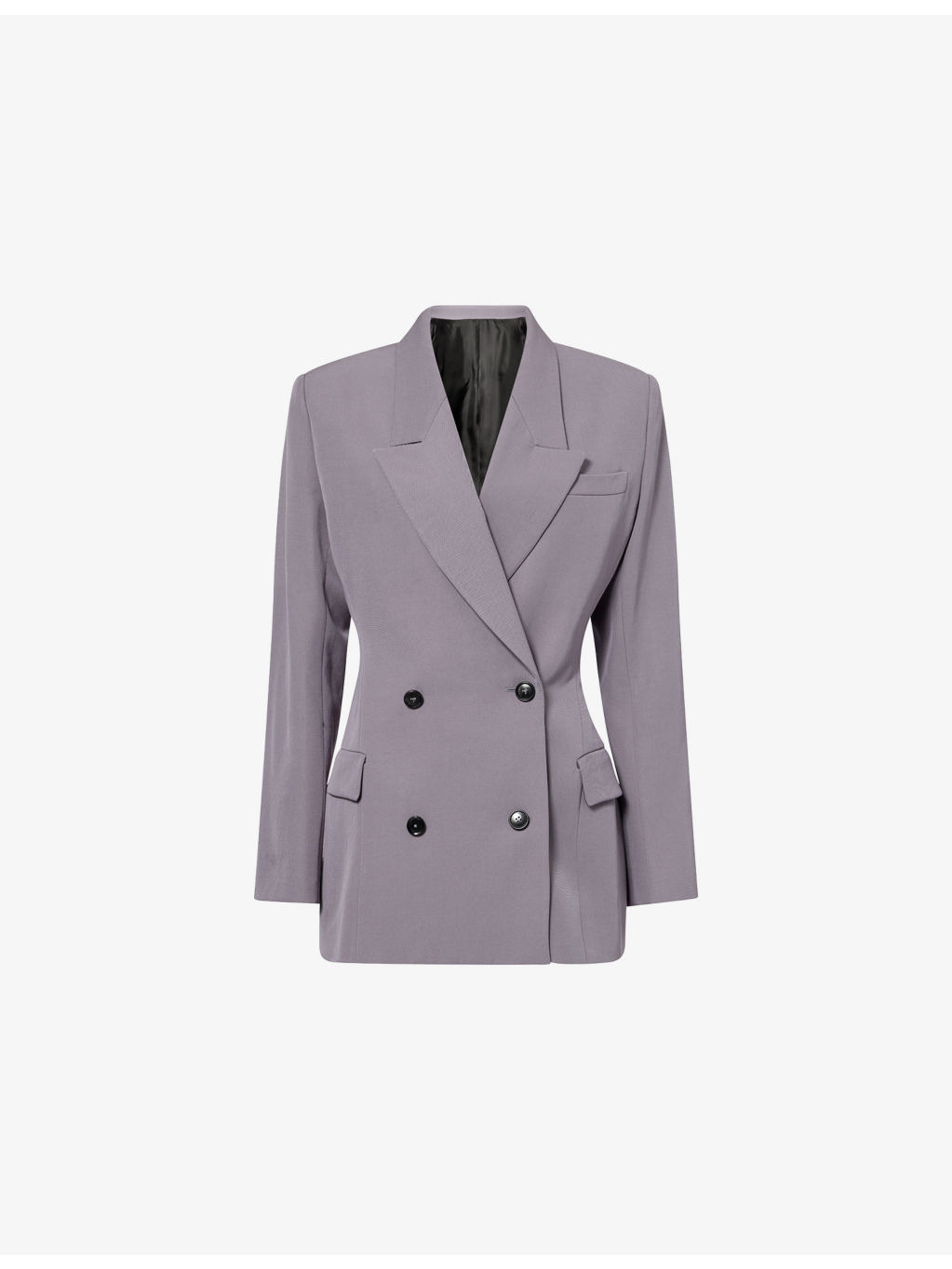 PRODUCT DETAILS - Alaia wool jacket - 100% wool; lining 100% cupro; pocketlining 100% cotton - Exposed button fastenings at front - Regular fit, double-breasted, peak lapels, padded shoulders, long sleeves, buttoned cuffs, one chest welt pocket, two front flap pockets, fully lined - Dry clean - Made in Italy - True to size - Size UK 10: length 31in / 78.5cm - Model is 5ft 10in / 1.78m and wears a size UK 10 - Midweight, non-stretch Ref: R04466850