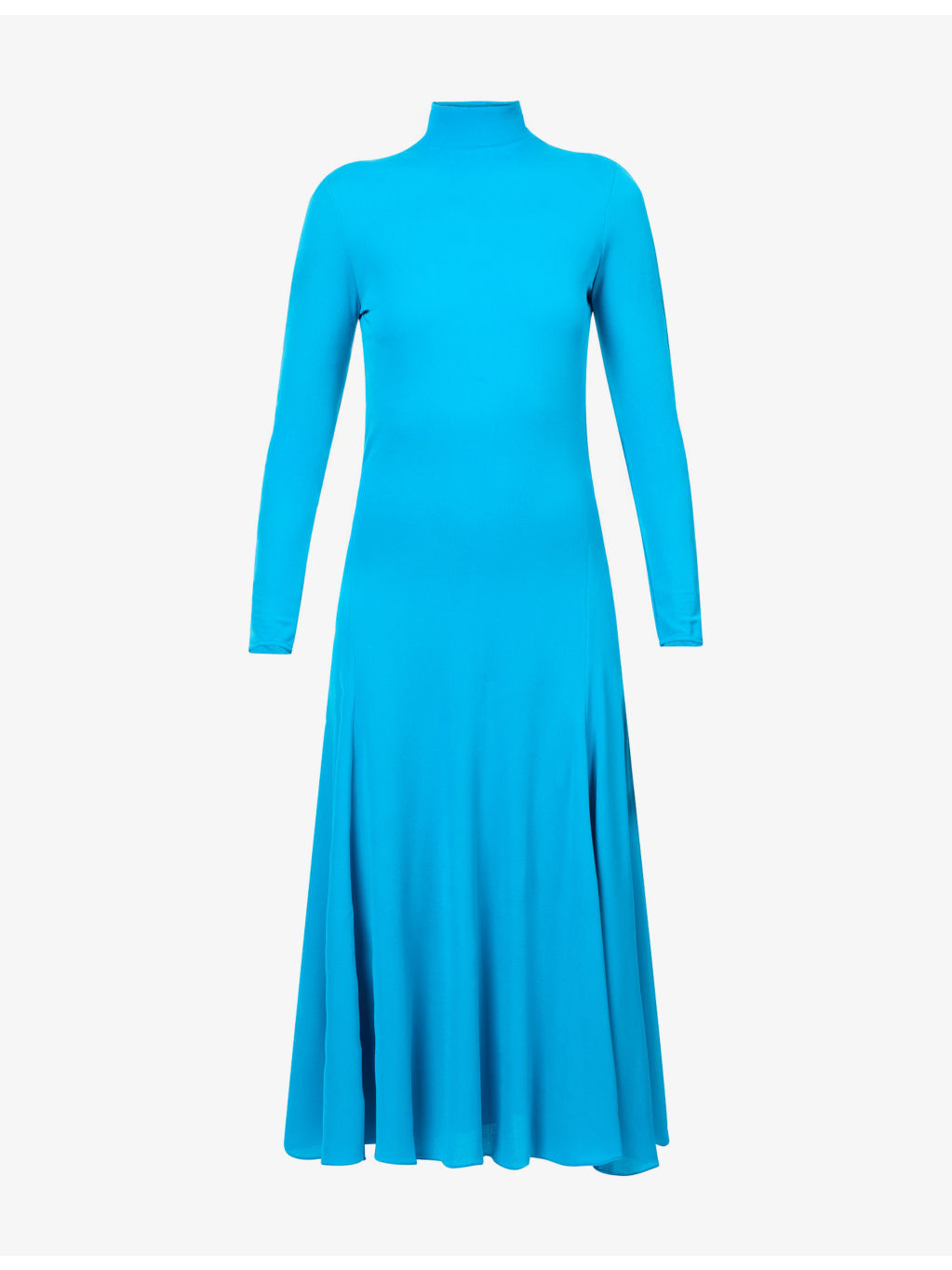 PRODUCT DETAILS - Alaia fluid-jersey midi dress - 100% viscose - Regular fit, high neck, long sleeves, heart-shaped cut-out at back, ankle length, fit-and-flare silhouette - Specialist dry clean only - Made in Italy - True to size - Size UK 8: length 51in / 130cm - Model is 5ft 10in/1.78m and wears a size UK 8 - Lightweight, stretchy Ref: R04508239