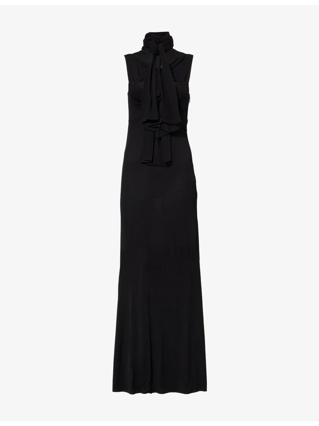 PRODUCT DETAILS - Alaia woven maxi dress - 100% viscose - Concealed hook-and-eye and zip fastening at side - Regular fit, high-neck, self-tie straps at neck, sleeveless, bow motifs at front, cut-out at front - Dry clean - Made in Italy - True to size - Size UK 8: length 57in / 144cm - Model is 5ft 10in/1.78m and wears a size UK 8 - Midweight, non-stretch Ref: R04508230