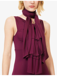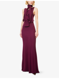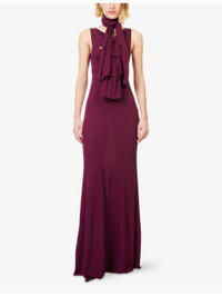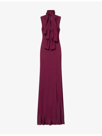 PRODUCT DETAILS - Alaia woven maxi dress - 100% viscose - Concealed hook-and-eye and zip fastening at side - Regular fit, high-neck, self-tie straps at neck, sleeveless, bow motifs at front, cut outs at front - Dry clean - Made in Italy - True to size - Size UK 8: length 57in / 144cm - Model is 5ft 10in/1.78m and wears a size UK 8 - Midweight, non-stretch Ref: R04508233