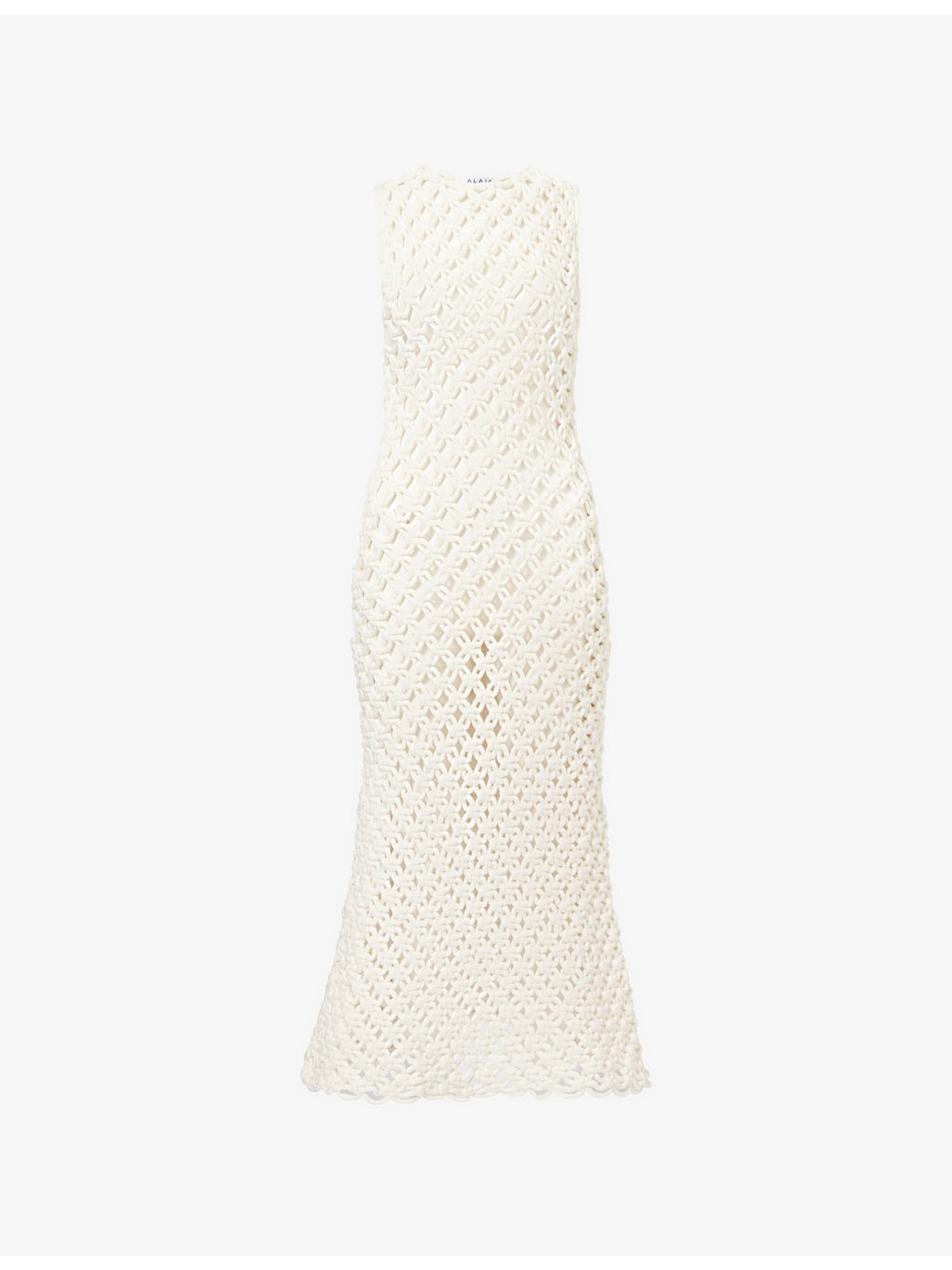 PRODUCT DETAILS - Alaia cotton-blend maxi dress - 62% cotton, 38% polyamide - Exposed button fastening at shoulder - Slim fit, round-neck, sleeveless, all-over knot design, all-over cut-out, flared hem - Dry clean - True to size - Size UK 8: length 49in / 125cm - Model is 5ft 10in / 1.78m and wears a size UK 10 - Midweight, stretchy Ref: R04466787