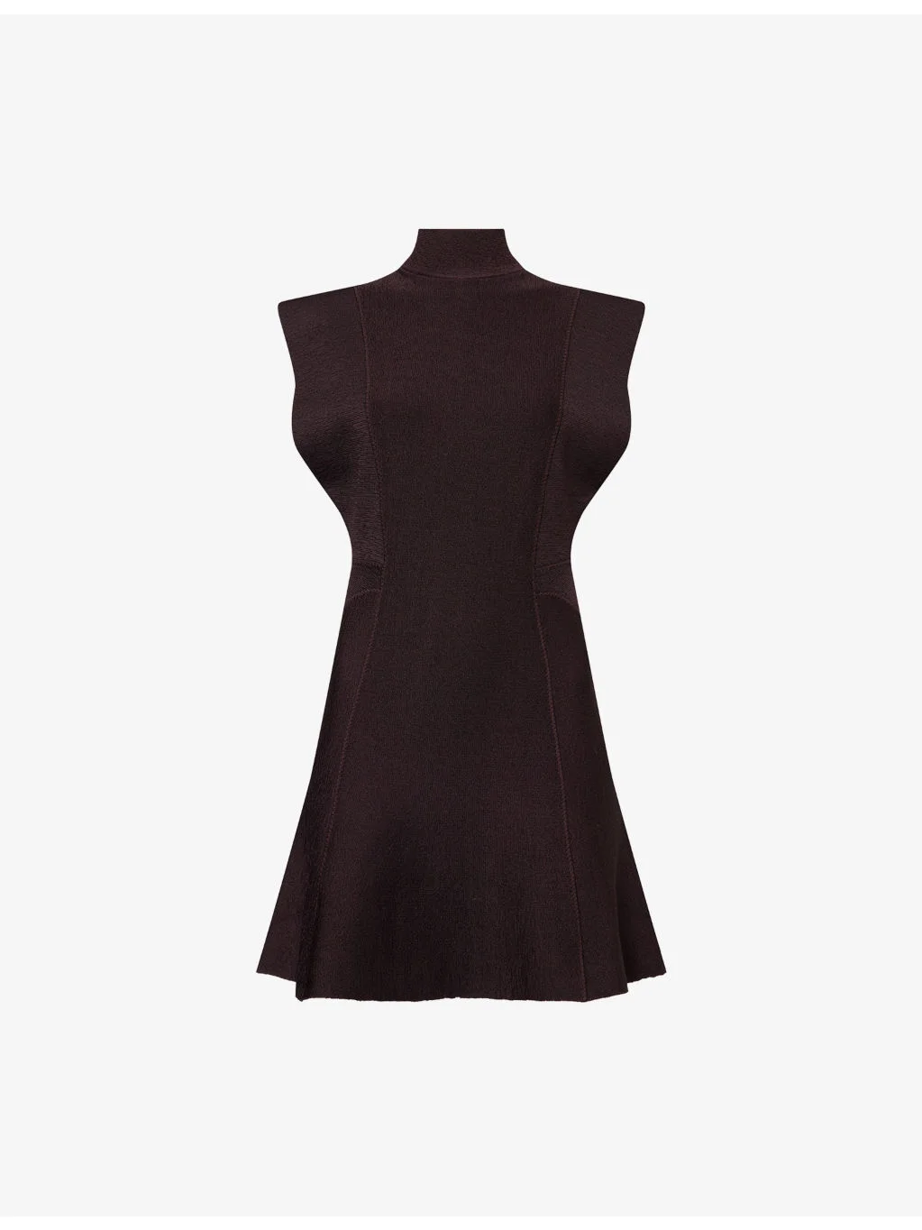 PRODUCT DETAILS - Alaia knitted mini dress - 53% viscose, 32% silk, 11% polyester, 3% polyamide, 1% elastane - Concealed zip fastening at back - Regular fit, high neck, sleeveless, panelled seam, flared hem - Dry clean - Made in Italy - True to size - Size UK 8: length 33in / 84cm - Model is 5ft 10in/1.78m and wears a size UK 8 - Midweight, stretchy Ref: R04602266