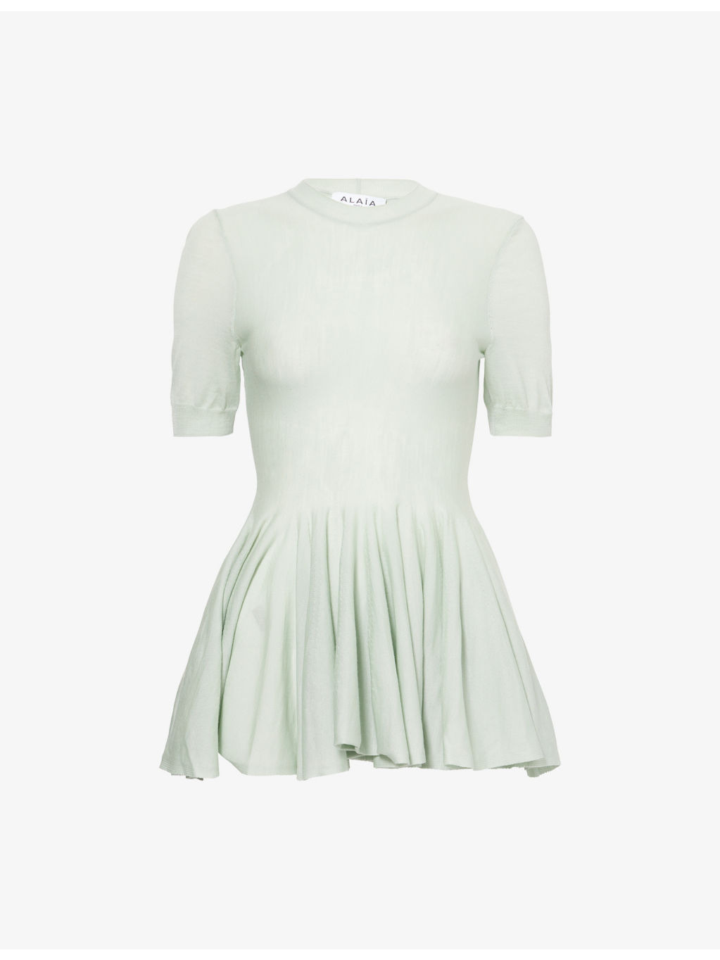 PRODUCT DETAILS - Alaia wool knitted top - 100% virgin wool - Slim fit, round neck, short sleeves, peplum hem, fine knit texture - Dry clean - True to size - Model is 5ft 10in/1.78m and wears a size UK 8 - Lightweight, stretchy Ref: R04466836
