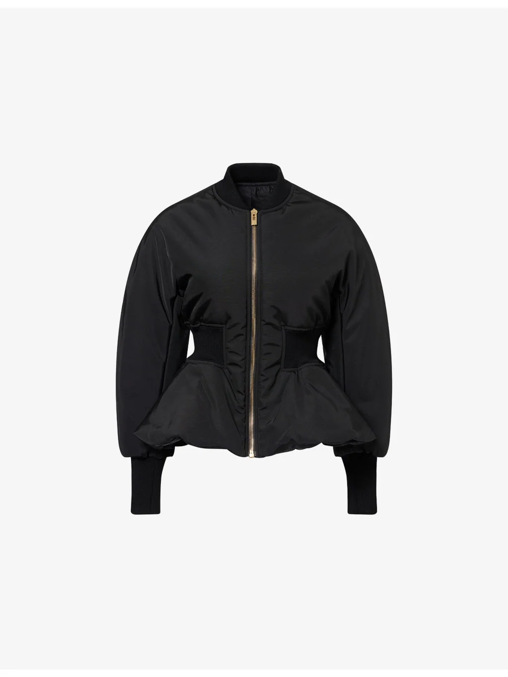 PRODUCT DETAILS - Alaia bomber jacket - 71% polyamide, 29% wool; lining 100% polyamide; pocketlining 100% cotton; trims 96% virgin wool, 2% elastane, 2% polyamide - Exposed zip fastening at front - Regular fit, dropped shoulders, long sleeves, elasticated cinched ribbed waist, two side slip pockets, ribbed trims, one interior slip pocket, peplum hem, cropped - Dry clean - Made in Italy - True to size - Size UK 8: length 24in / 61cm - Model is 5ft 10in/1.78m and wears a size UK 8 - Midweight, non-stretch Ref: R04558228