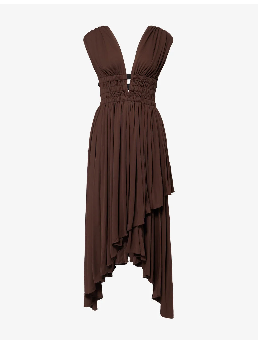 PRODUCT DETAILS - Alaia jersey midi dress - 100% viscose - Regular fit, plunge V-neck, sleeveless, shirred waistband, flared asymmetric hem - Dry clean - Made in Italy - True to size - Size UK 8: length 48in / 122cm - Model is 5ft 10in/1.78m and wears a size UK 8 - Midweight, stretchy Ref: R04602272