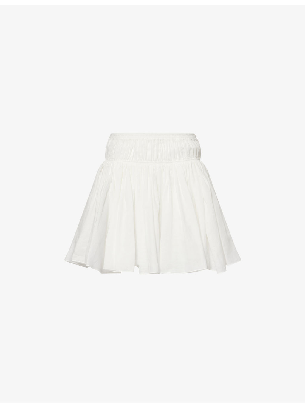 PRODUCT DETAILS - Alaia cotton and linen mini skirt - 76% cotton, 24% linen - Regular fit, A-line silhouette, elasticated waistband, ruffled - Specialist dry clean only - Made in Italy - True to size - Size UK 8: length 18in / 46cm - Model is 5ft 10in/1.78m and wears a size UK 8 - Lightweight, slight stretch Ref: R04466815