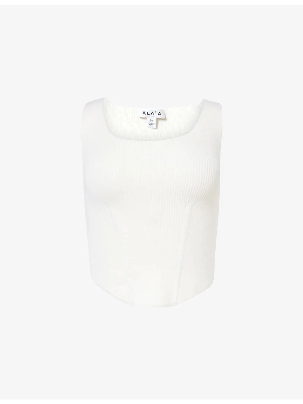 PRODUCT DETAILS - Alaia wool-blend top - 92% wool, 7% polyamide, 1% elastane - Regular fit, scoop neck, sleeveless, asymmetric hem, ribbed knit - Dry clean - Made in Italy - True to size - Model is 5ft 10in/1.78m and wears a size UK 8 - Midweight, slight stretch Ref: R04558187