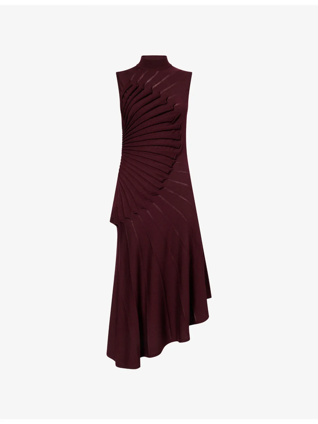 PRODUCT DETAILS - Alaia wool midi dress - 100% wool - Regular fit, mock neck, sleeveless, textured panel at front and back, asymmetric hem - Dry clean - Made in Italy - True to size - Size UK 8: length 52in / 133cm - Model is 5ft 10in/1.78m and wears a size UK 8 - Midweight, slight stretch Ref: R04558214