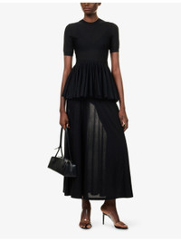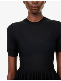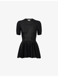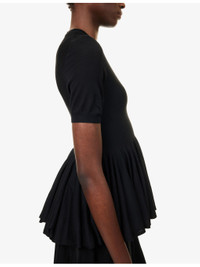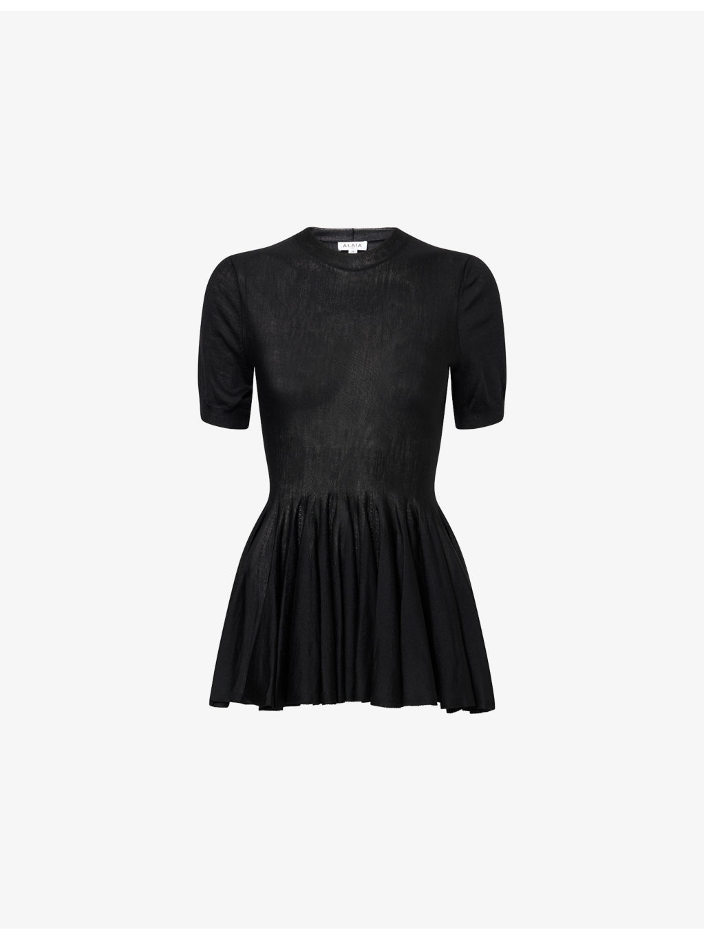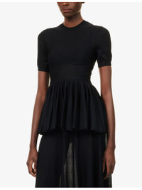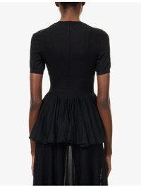 PRODUCT DETAILS - Alaia wool top - 100% wool; trims 75% wool, 23% polyamide, 2% polyurethane - Regular fit, high neck, short sleeves, ribbed trims, peplum hem, semi-sheer finish - Dry clean - Made in Italy - True to size - Model is 5ft 10in/1.78m and wears a size UK 8 - Lightweight, stretchy Ref: R04466801