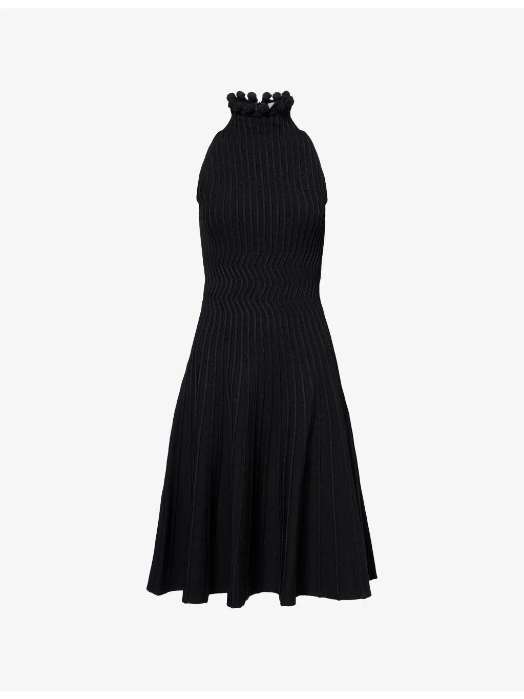 PRODUCT DETAILS - Alaia knitted midi dress - 69% viscose, 23% polyester, 7% polyamide, 1% elastane - Concealed zip fastening at back - Slim fit, embellished high-neck, sleeveless, all-over knitted and ribbed, flared hem - Specialist dry clean - Made in Italy - True to size - Size UK 8: length 42in / 107cm - Model is 5ft 10in/1.78m and wears a size UK 8 - Midweight, stretchy Ref: R04559947