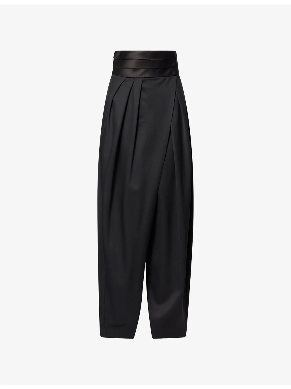 PRODUCT DETAILS - Alaia wool trousers - 100% wool - Button, hook-and-eye and zip-fly fastening - Regular fit, high rise, barrel leg, gathered structured waistband, slip pockets at front - Dry clean only - True to size - Size UK 8: rise 15in / 38cm, inside leg 32in / 81cm, leg opening 18in / 46cm - Model is 5ft 10in/1.78m and wears a size UK 8 - Lightweight, non-stretch Ref: R04558198