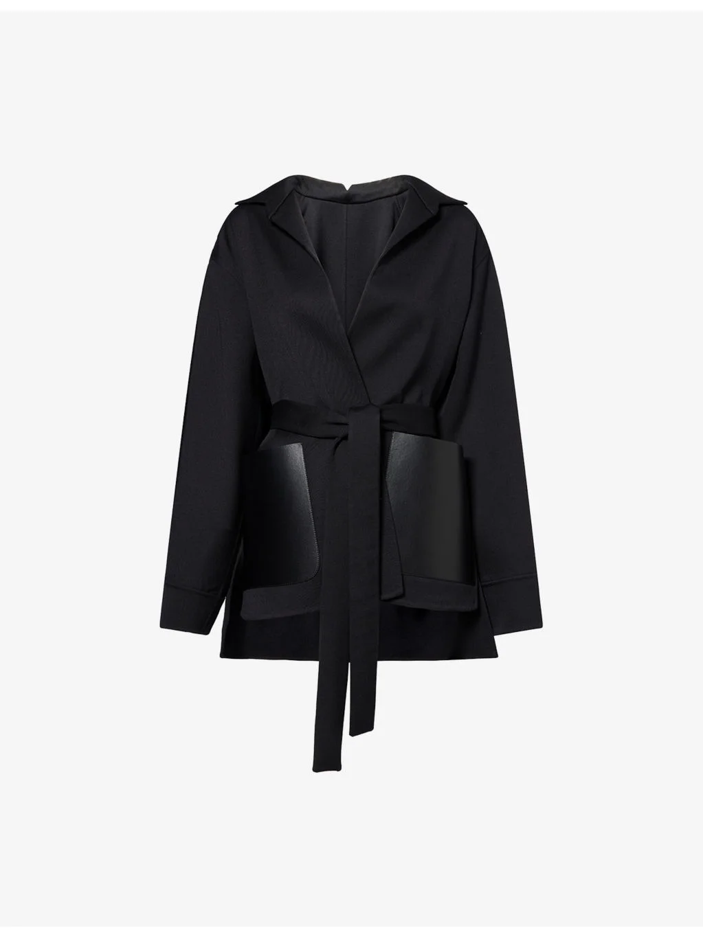 PRODUCT DETAILS - Alaia wool jacket - 100% virgin wool; contrast 100% lamb leather - Self-tie fastening - Relaxed fit, spread-collar, long sleeves, two leather patch pockets at front, leather loop and pleat at back, detachable belt, split at sides - Specialist leather clean - Made in Italy - Size UK 8: length 27in / 70cm - Model is 5ft 10in/1.78m and wears a size UK 8 - Midweight, slight stretch Ref: R04558231
