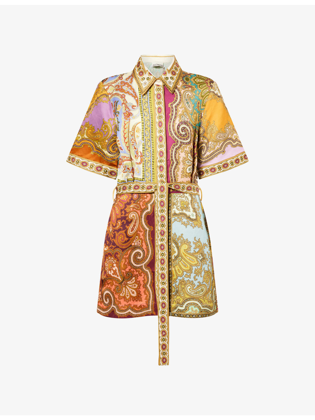 PRODUCT DETAILS - ALEMAIS flax-blend mini dress - 56% flax, 44% viscose - Concealed button fastenings at front - Regular fit, classic collar, short sleeves, matching belt, side slip pockets, all-over paisley pattern - Dry clean - True to size - Size UK 8: length 33.5in / 85cm - Model is 5ft 10in/1.78m and wears a size UK 8 - Midweight, non-stretch Ref: R04488184