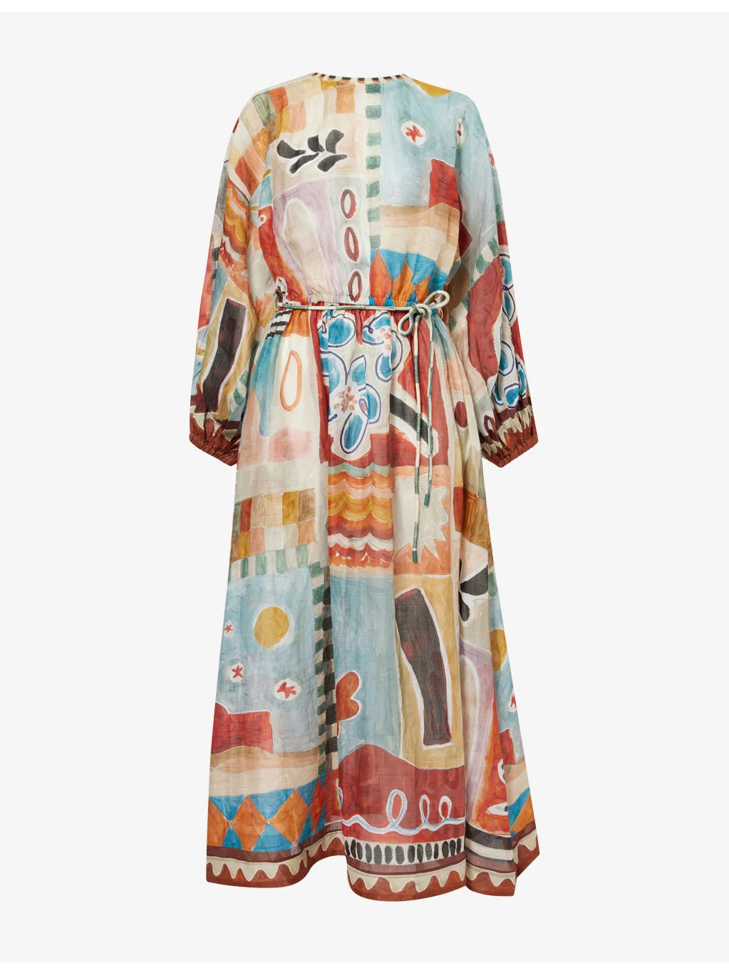 PRODUCT DETAILS - Alemais ramie midi dress - 100% ramie - Button fastening at back - Regular fit, round neck, long sleeves, elasticated cuffs, matching belt, side slip pockets, all-over graphic pattern - Dry clean - True to size - Size UK 8: length 56in / 142cm - Model is 5ft 10in/1.78m and wears a size UK 8 - Lightweight, non-stretch Ref: R04602528