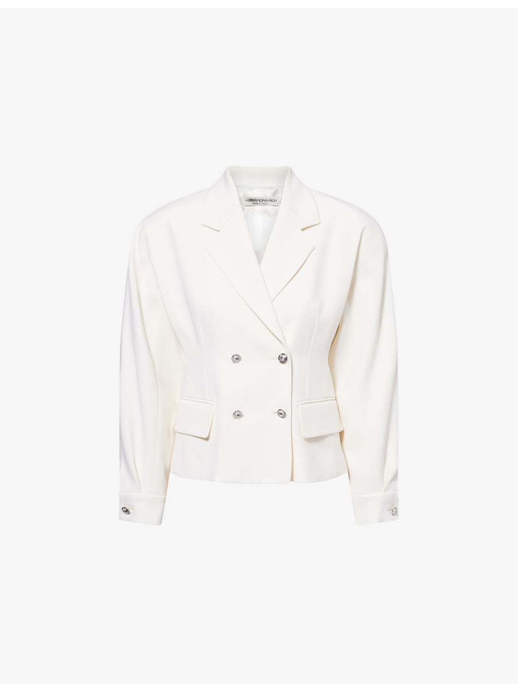 PRODUCT DETAILS - Alessandra Rich stretch-wool blend blazer - 96% virgin wool, 3% polyamide, 1% elastane; lining 100% viscose - Exposed button fastening at front - Regular fit, double-breasted, notch lapels, padded shoulders, long sleeves, buttoned cuffs, two flap pockets at front, rhinestone buttons, darts at front and back, cinched waist, all-over crepe texture, fully lined - Specialist dry clean only - Made in Italy - True to size - Size UK 8: length 22in / 56cm - Model is 5ft 10in/1.78m and wears a size UK 8 - Midweight, stretchy Ref: R04462690