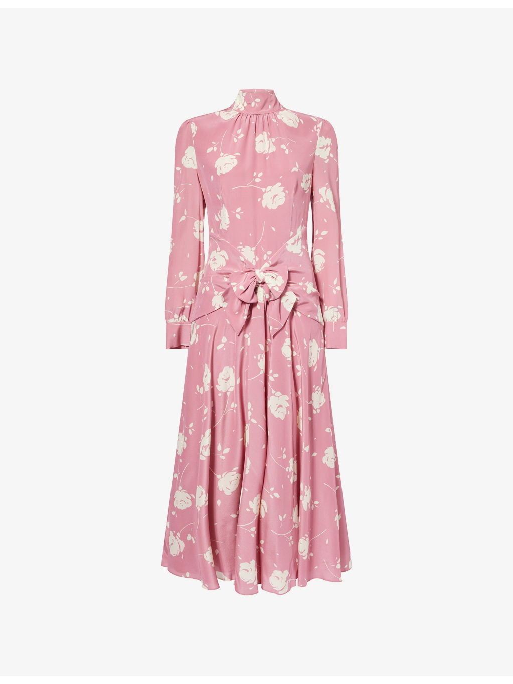 PRODUCT DETAILS - Alessandra Rich silk midi dress - 100% silk; lining 100% polyester - Concealed zip fastening at back - Regular fit, high-neck, puffed shoulders, long sleeves, buttoned cuffs, bow embellishment at front, ruched panel at front and back, all-over floral print, all-over satin texture, fully lined - Specialist dry clean only - Made in Italy - True to size - Size UK 8: length 50in / 128cm - Model is 5ft 10in/1.78m and wears a size UK 8 - Lightweight, slight stretch Ref: R04462683
