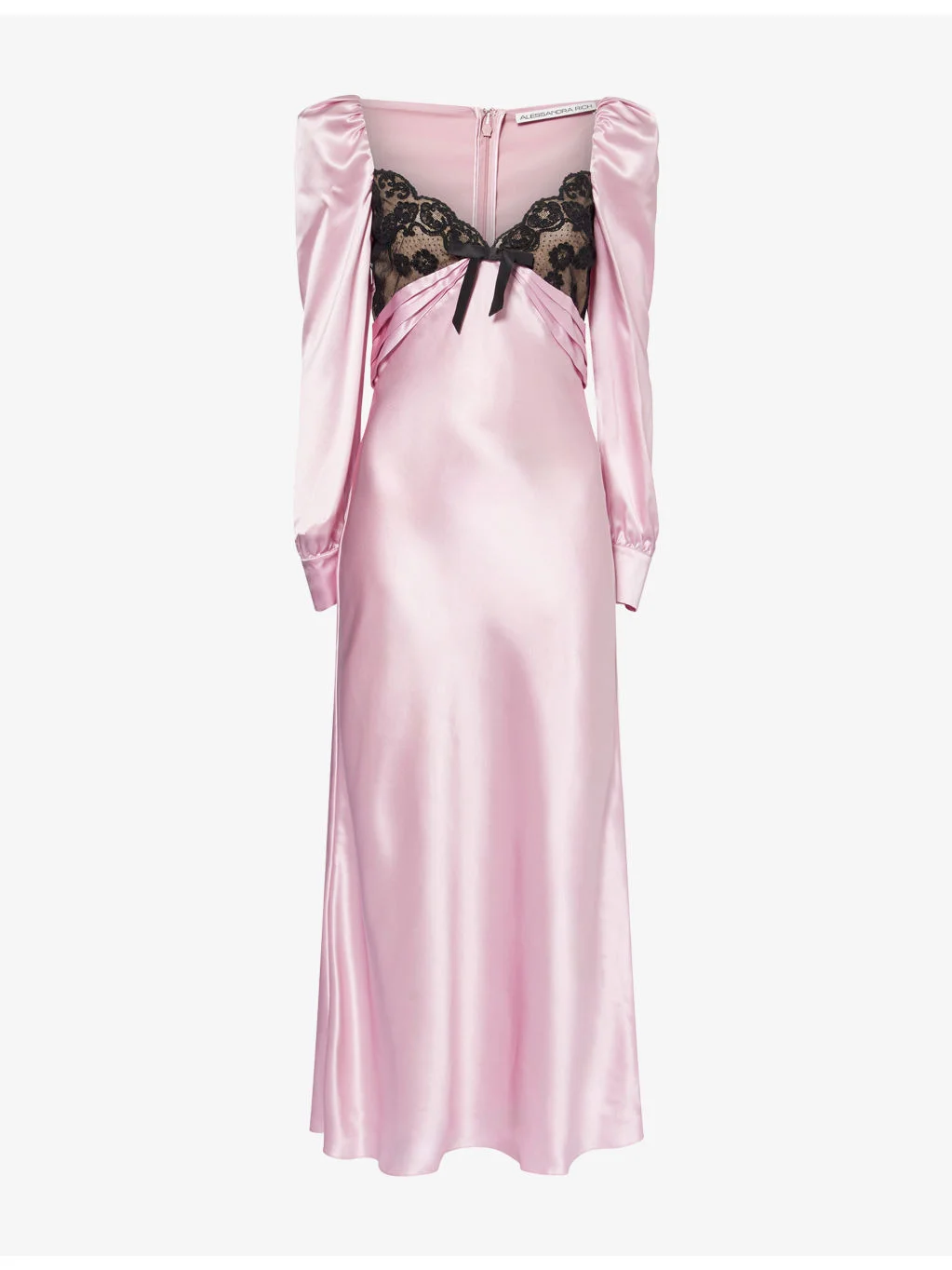 PRODUCT DETAILS - Alessandra Rich silk midi dress - 100% silk - Concealed zip fastening - Regular fit, long sleeves, buttoned cuffs, padded shoulders, v-neck, lace layer at bust, bow at front, pleated waistband, lined - Dry clean - Made in Italy - True to size - Size UK 8: length 52in / 132cm - Model is 5ft 10in/1.78m and wears a size UK 8 - Lightweight, non-stretch Ref: R04550891