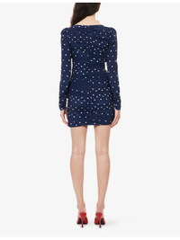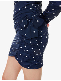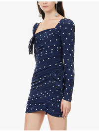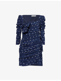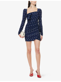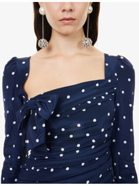 PRODUCT DETAILS - Alessandra Rich woven mini dress - 55% polyamide, 34% cotton, 11% polyester; lining 100% polyester - Concealed zip fastening at back - Slim fit, square neck, long sleeves, buttoned cuffs, bows embellishment at front, draped, all-over polka-dot print, all-over satin texture, fully lined - Specialist dry clean only - Made in Italy - True to size - Size UK 8: length 31in / 80cm - Model is 5ft 10in/1.78m and wears a size UK 8 - Lightweight, stretchy Ref: R04462682