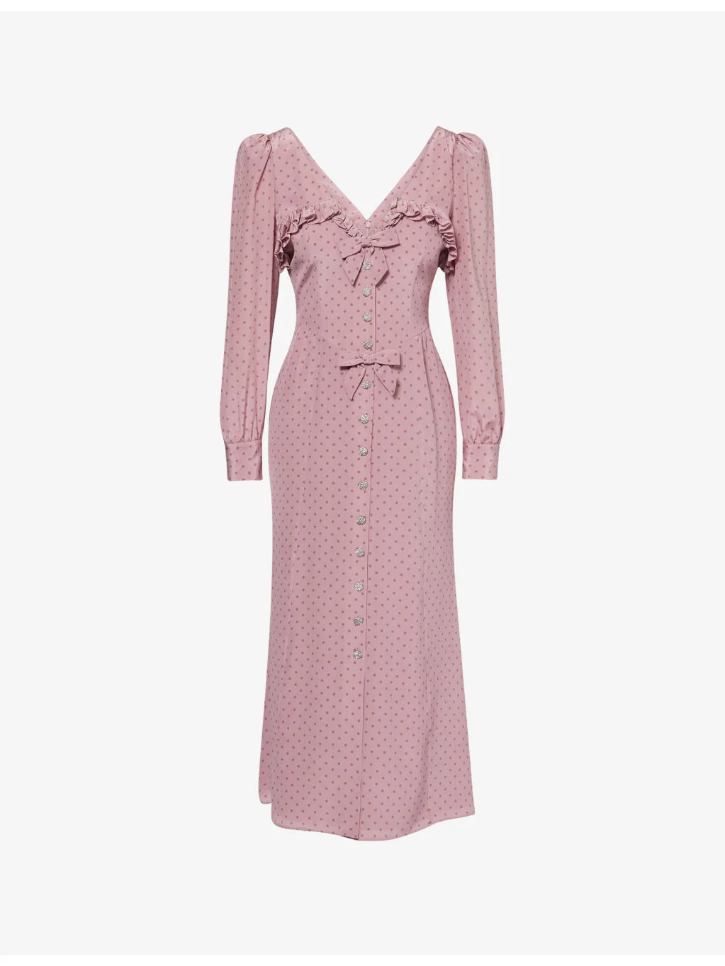 PRODUCT DETAILS - Alessandra Rich silk midi dress - 100% silk; lining 100% polyester - Concealed zip fastening at back - Regular fit, midi length, v-neck and back, long sleeves, buttoned cuffs, frilled trim chest, bows at front, embellished jewel buttons, fully lined - Dry clean - Made in Italy - True to size - Size UK 8 : length 53in / 134.5cm - Model is 5ft 10in/1.78m and wears a size UK 8 - Lightweight, non-stretch Ref: R04550890