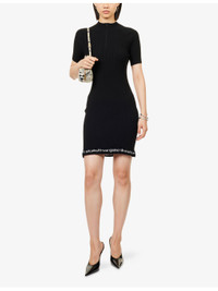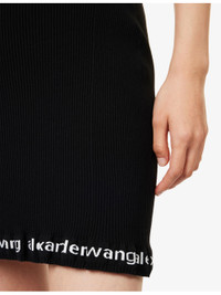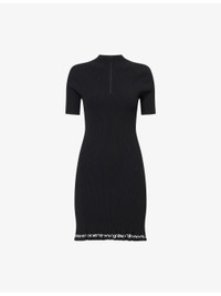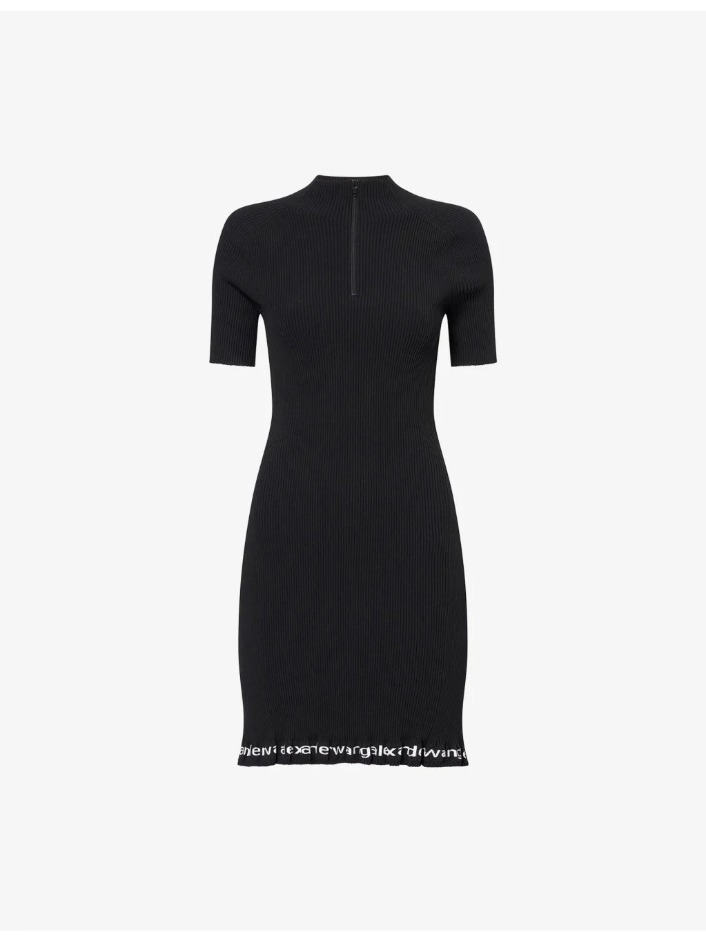 PRODUCT DETAILS - Alexander Wang stretch-woven mini dress - 88% polyamide, 12% elastane - Exposed zip fastening at front - Slim fit, high-neck, short sleeves, all-over knitted and ribbed, branded frilled hem - Specialist dry clean only - True to size - Size small: length 33in / 84cm - Model is 5ft 10in/1.78m and wears a size small - Midweight, stretchy Ref: R04552140