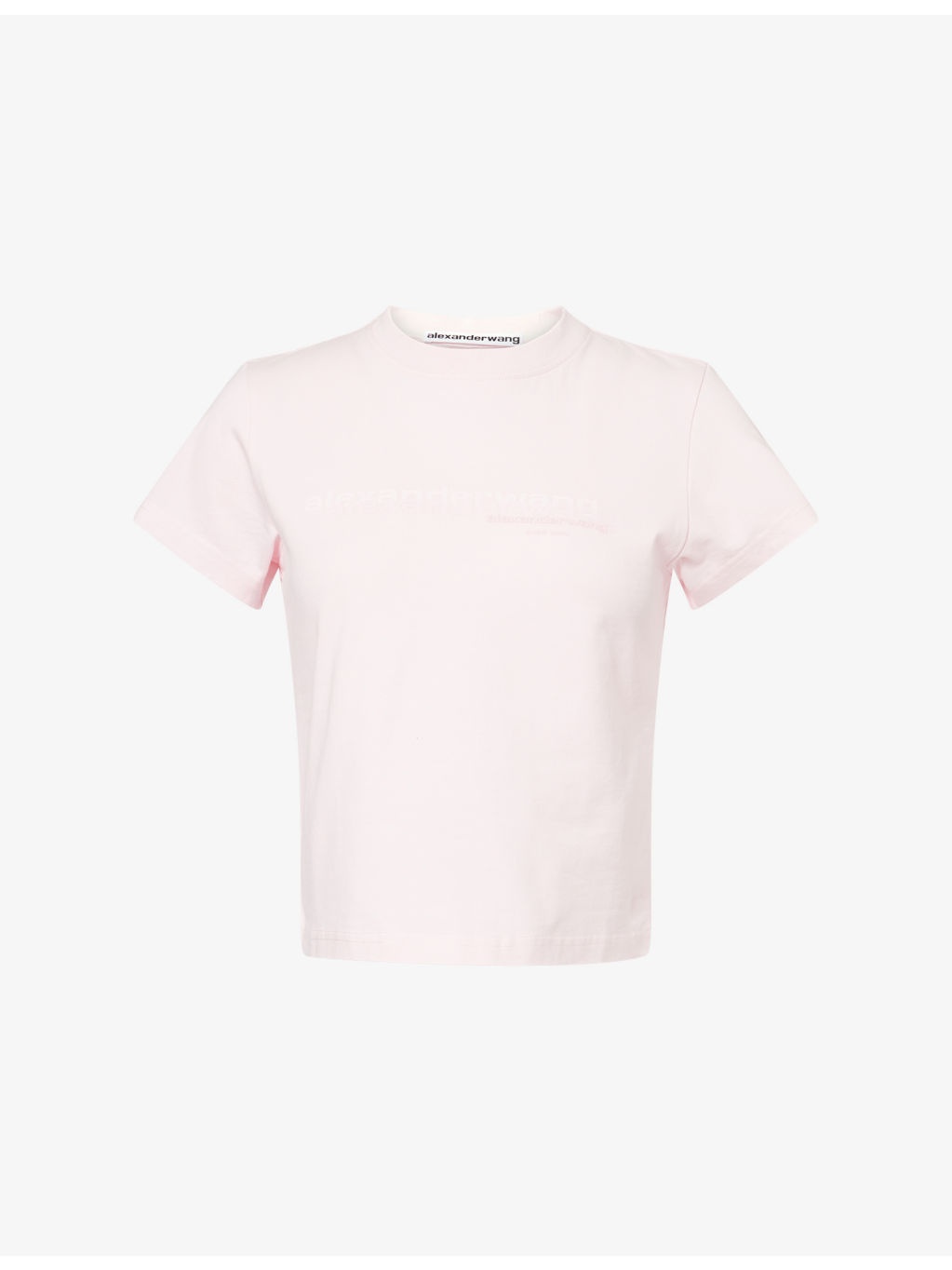 PRODUCT DETAILS - Alexander Wang cotton-jersey T-shirt - 100% cotton; trims 99% cotton, 1% elastane - Relaxed fit, cropped, ribbed round-neck, short sleeves, brand print and embossed branding at front - Machine wash at 30°C - Made in Portugal - True to size - Model is 5ft 10in/1.78m and wears a size small - Lightweight, stretchy Ref: R04472423
