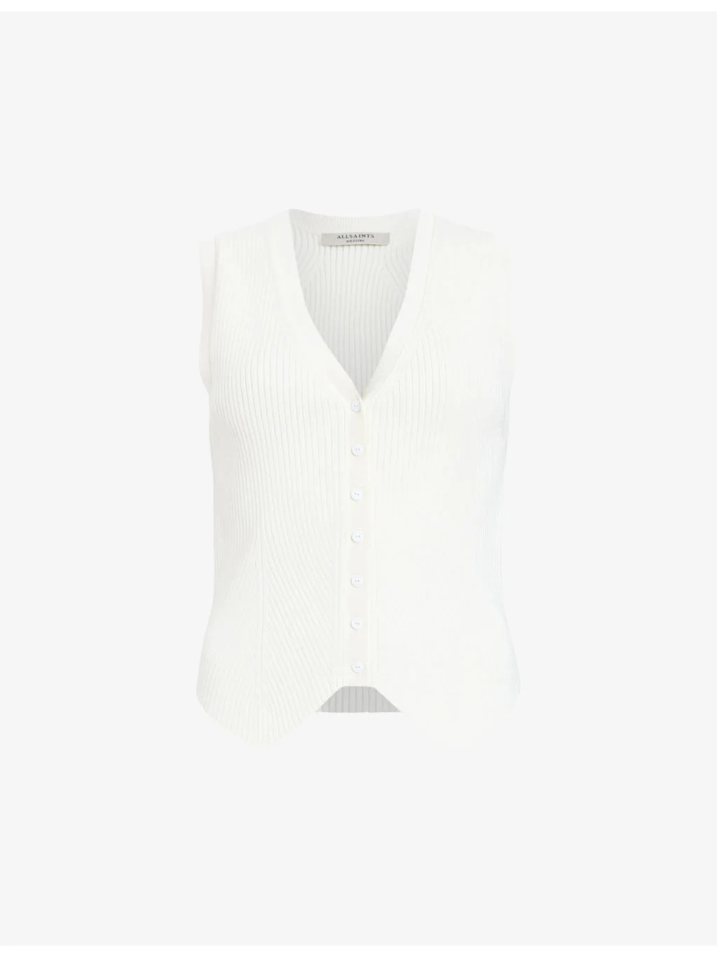 PRODUCT DETAILS - AllSaints stretch-knit waistcoat - 72% viscose, 28% polyester - Exposed button fastening at front - Slim fit, V-neckline, sleeveless, irregular hem - Hand wash - True to size - Model is 5ft 9in/1.75m and wears a size UK 8 - Midweight, slight stretch Ref: R04248296