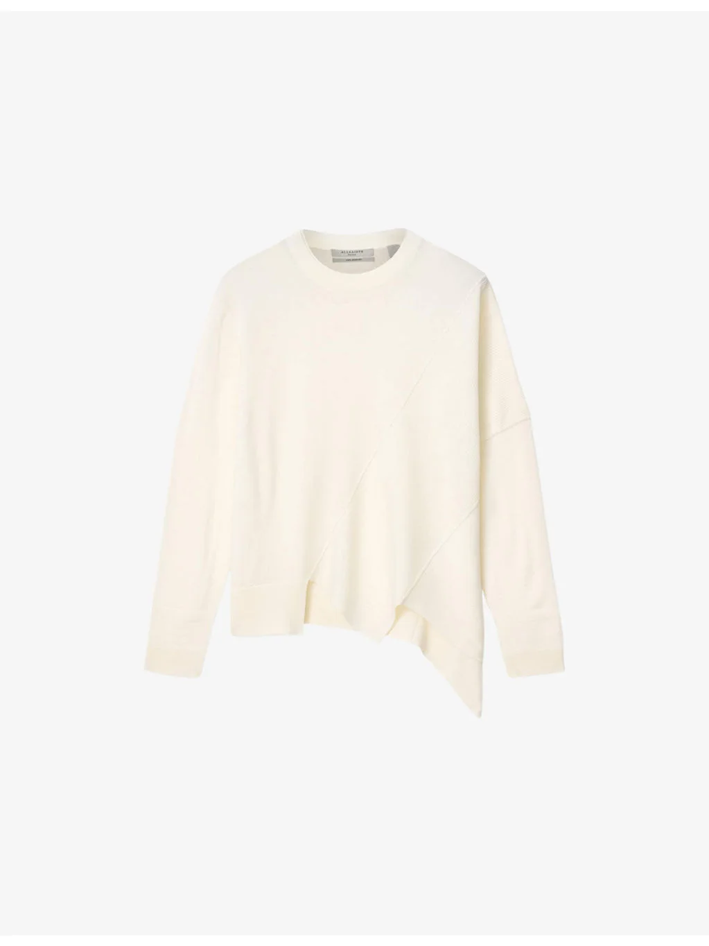 PRODUCT DETAILS - AllSaints merino-wool jumper - 100% wool - Regular fit, crewneck, long sleeves, asymmetric hem - Machine wash mild - True to size - Model is 5ft 11in/1.80m and wears a size UK 8 - Midweight, non-stretch Ref: R04497810