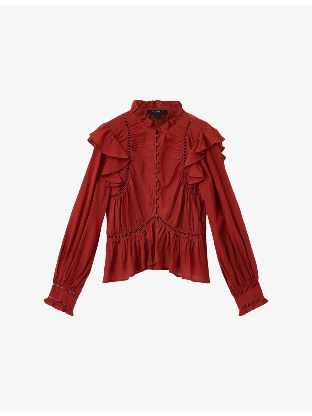 PRODUCT DETAILS - AllSaints cotton-blend blouse - 55% cotton, 45% viscose - Exposed button fastening at front - Regular fit, high neck, ruffle detail, long sleeves, ladder effect detail - Machine wash mild - True to size - Lightweight, non-stretch Ref: R04524568
