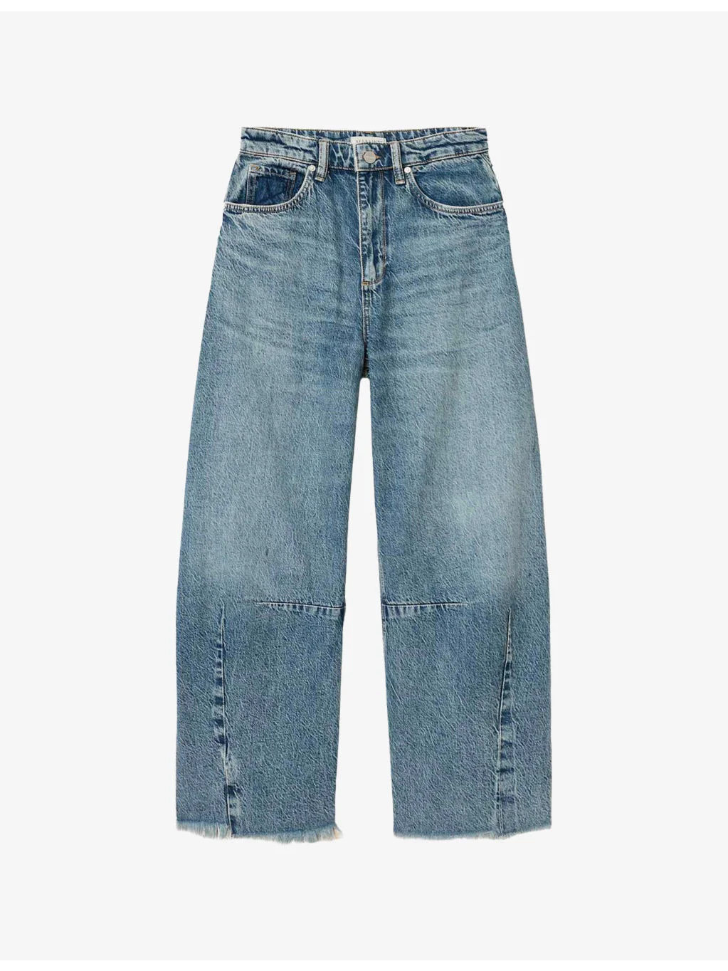 PRODUCT DETAILS - AllSaints denim jeans - 100% cotton - Button and zip-fly fastening - Regular fit, high-rise, barrel leg, belt loops, side pockets, back pockets, frayed hems, faded wash - Machine wash mild - True to size - Midweight, non-stretch Ref: R04524565