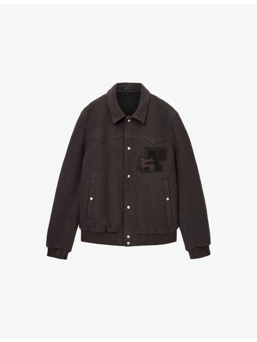 PRODUCT DETAILS - AllSaints wool jacket - 100% wool - Exposed popper fastenings at front - Relaxed fit, collared, logo patch at the side, long sleeves, two pockets at the side, ribbed trims - Dry clean - Midweight, non-stretch Ref: R04524336