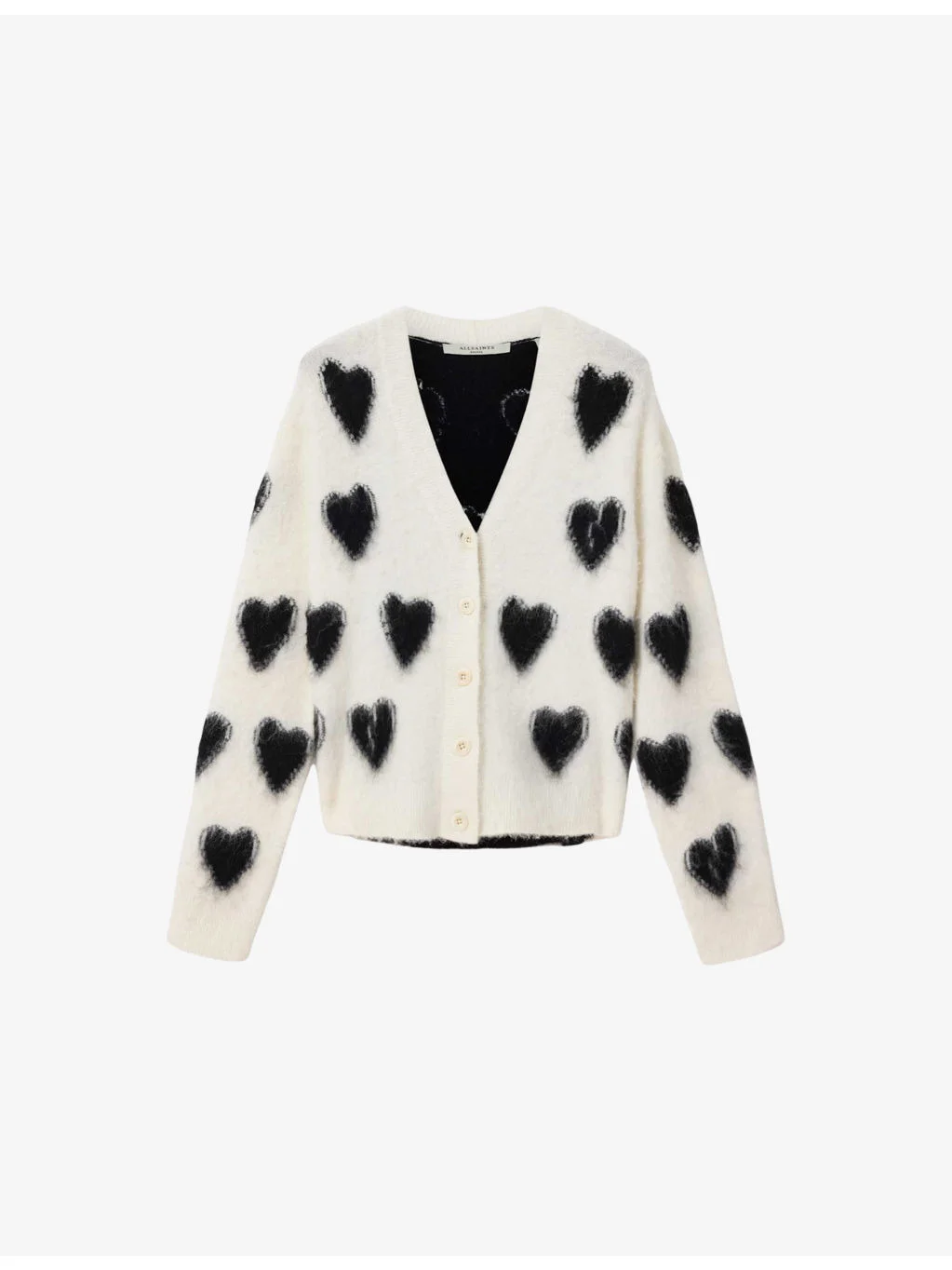PRODUCT DETAILS - AllSaints wool and alpaca-blend cardigan - 32% alpaca, 32% wool, 30% polyamide, 6% elastane - Exposed button fastening at front - Regular fit, V-neck, button-down design, long sleeves, all-over scatter heart motif ribbed trims - Hand wash - True to size - Midweight, slight stretch Ref: R04524499