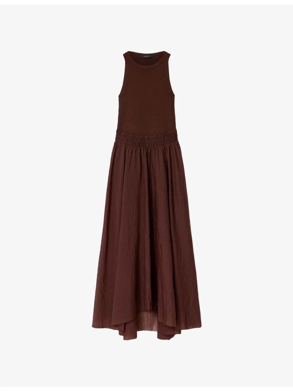 PRODUCT DETAILS - AllSaints stretch-woven midi dress - 57% viscose, 25% polyester, 16% polyamide, 2% elastane - Regular fit, round-neck, sleeveless, ribbed top, chiffon skirt - Machine wash mild - True to size - Model is 5ft 10in/1.78m and wears a size small - Lightweight, slight stretch Ref: R04398660