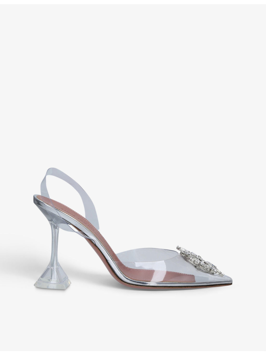 PRODUCT DETAILS - Amina Muaddi PVC heeled courts - 100% PVC - Strap fastening - Hourglass-shaped heel, pointed toe, open toe, silver-toned hardware, crystal-embellished brooch at front, logo-embossed at insole - Heel height 3.7"" - Made in Italy - Upper: 100% PVC - Lining: 100% PVC - Sole: 100% rubber Ref: R03748807